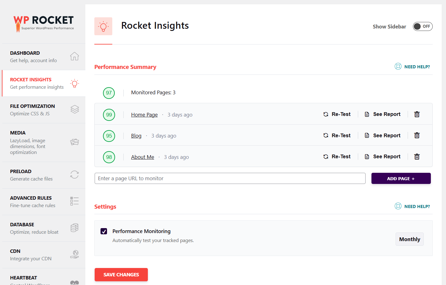 The Rocket Insights Add-on is available from WP Rocket 3.20 version, and it uses GTmetrix to show and monitor the performance grade of a website based on specific pages.