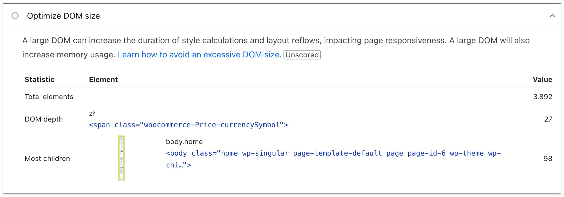 The Optimize DOM size insight detects if a web page has an excessively large Document Object Model (DOM), and reports the total DOM elements for a page, the page's maximum DOM depth, and the element with the most child elements.