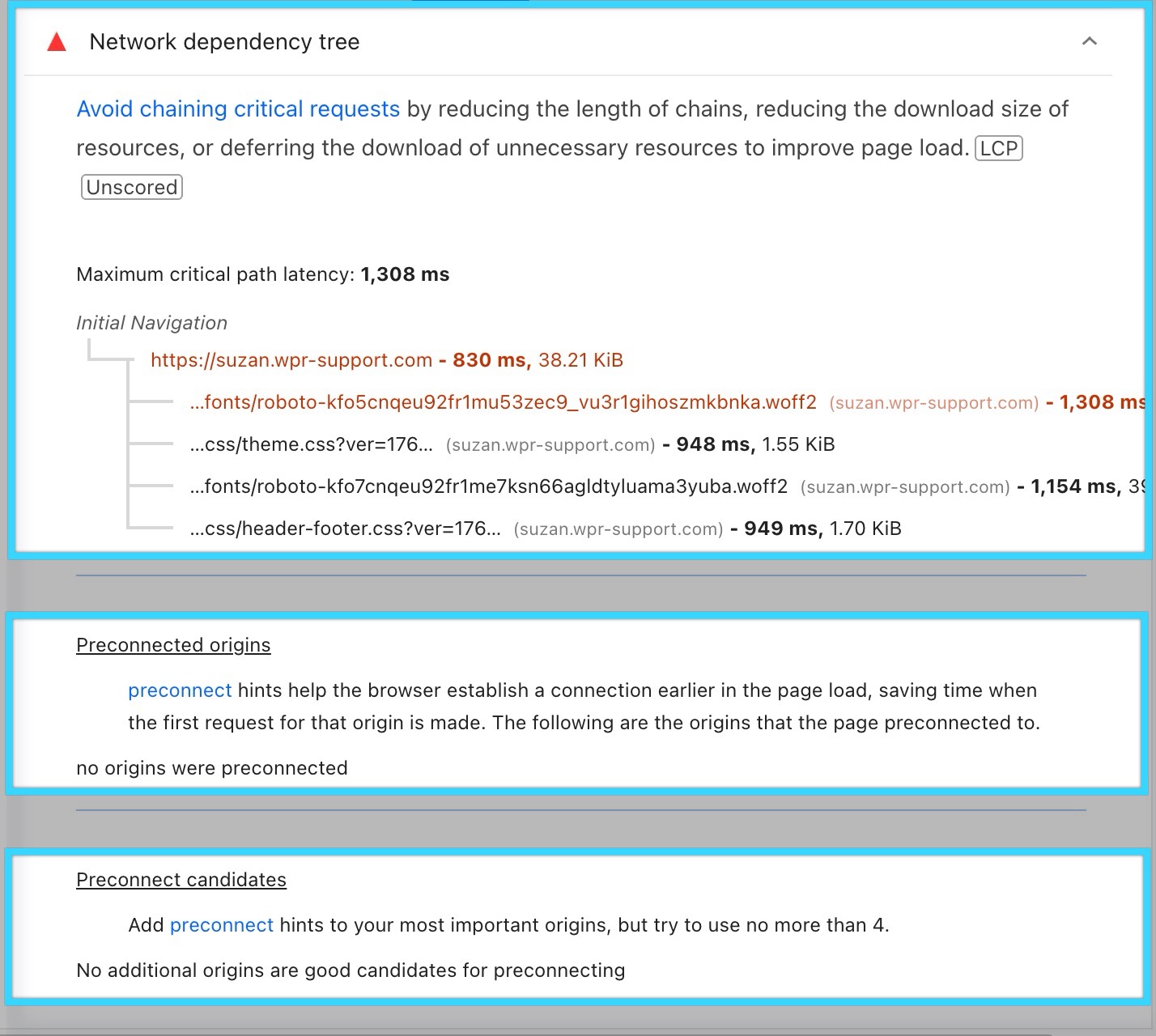 The Network Dependency Tree insight is a new combination of the previous “Preconnect to required origins” and “Avoid chaining critical requests” audits.